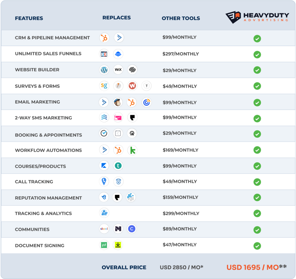 The Heavy Duty Platform is everything that marketers need to manage their leads, websites, funnels, calendars and many other services that are needed to maintain a customer.